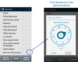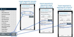The Import Waypoints can be used to plan the places to visit or survey. The user can introduce manually the geographic coordinates (lat, long) of the place or alternatively search for a street address/point of interest that will be converted to coordinates (geocoding conversion).
