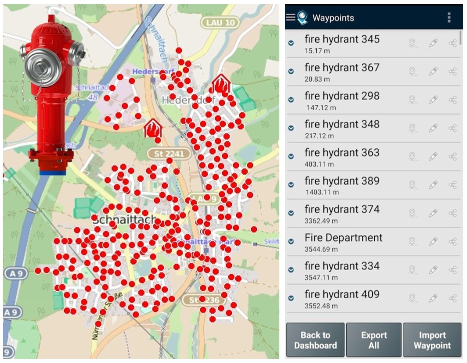 Another use case is to import rescue Points, such as the hydrant locations from a fire department. During the response time, the tool can support an emergency agent (e.g fireman) to get the nearest ones (sort Points by proximity) and obtain directions to each of them.
