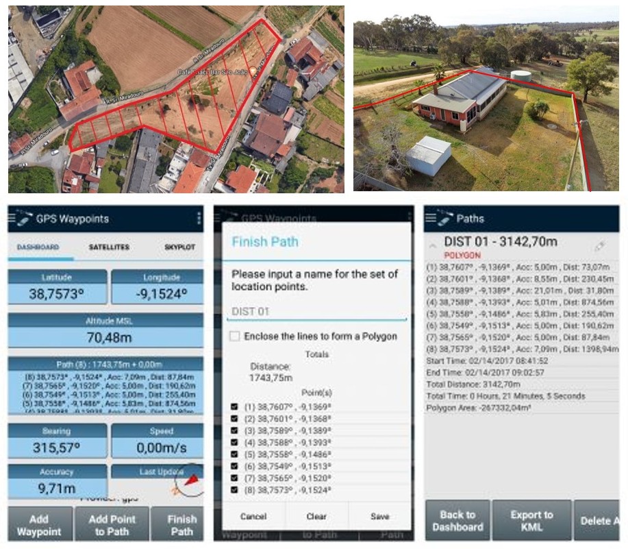 The tool is used by Real Estate owners, evaluators or buyers in order to measure land properties, determining boundaries and areas, for planning and valuation purposes. The user must collect sequential points of the land surroundings and close the path to build a polygonal area.