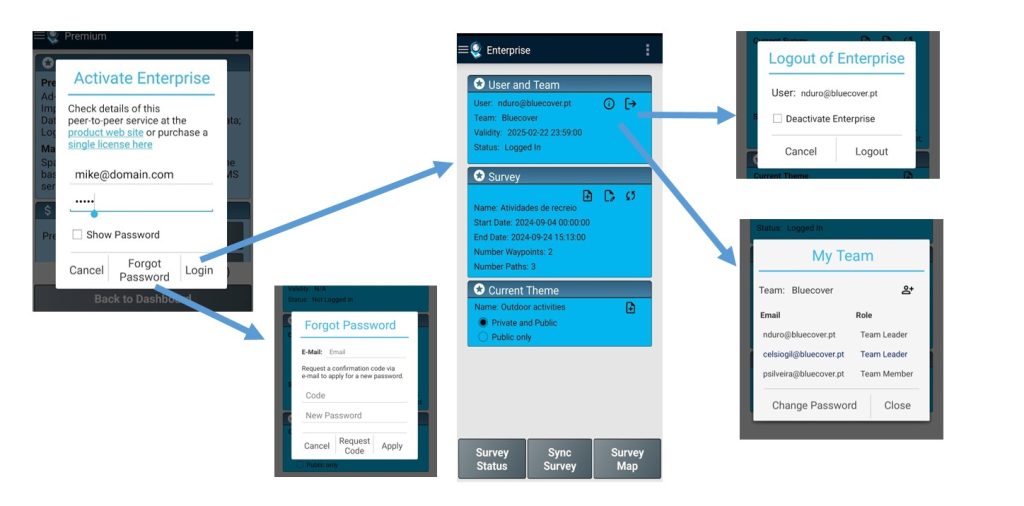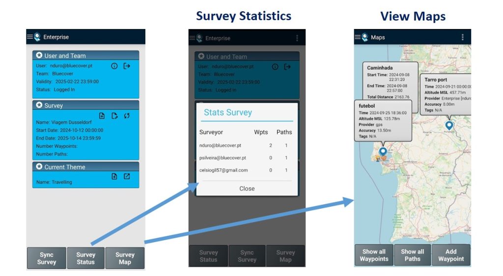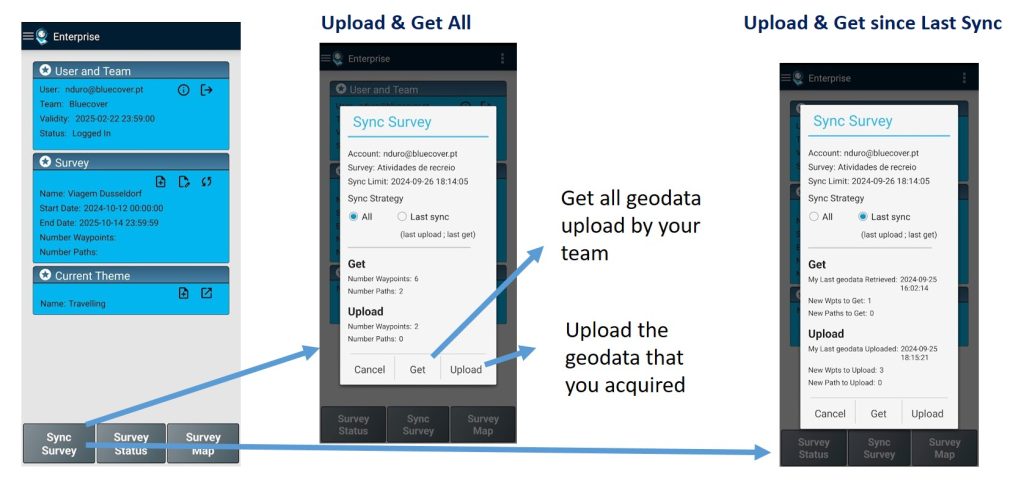 Geodata synchronization: the survey data synchronization is an essential aspect of cooperation between members. Your data can be uploaded to the server and you can get the data uploaded by your team.
