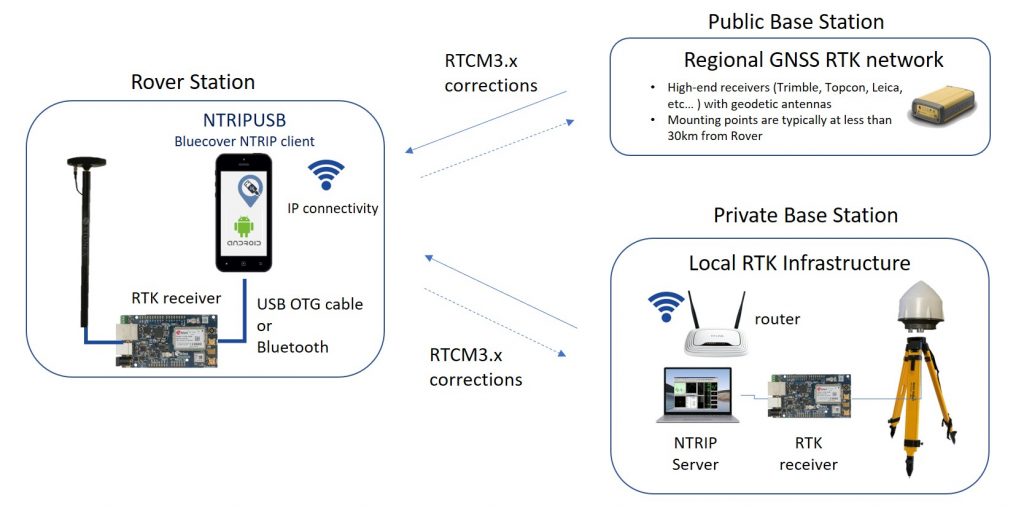 The NTRIP Client is an Android application for high precision positioning that allows to provide GNSS corrections to your RTK receiver. The application gets GNSS message corrections from a public or private Base Station, via Internet or IP private network, and sends them out to the serial port (USB or Bluetooth) of your Rover Station.