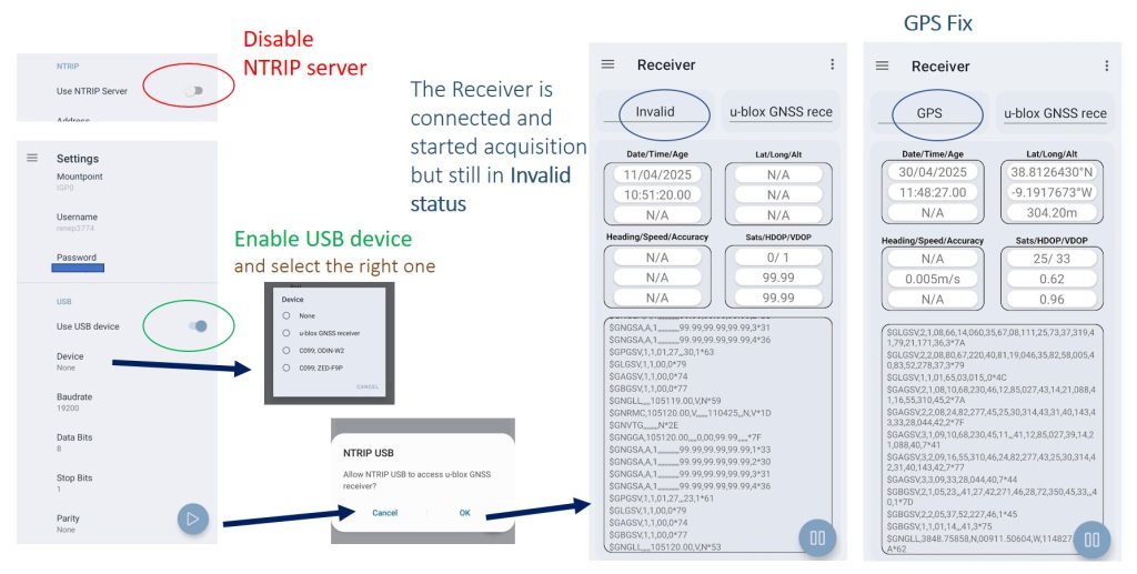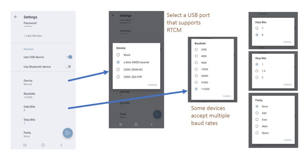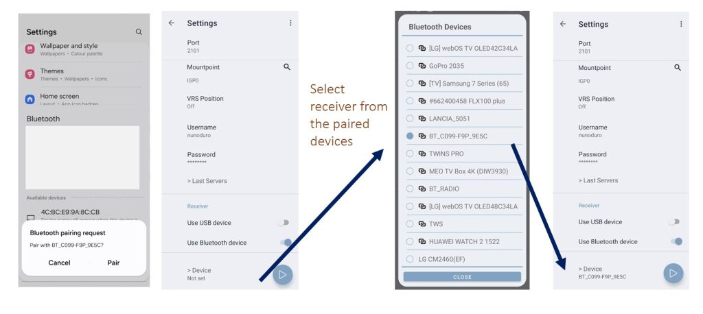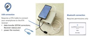 The NTRIP Client application running on a Android device should connected to the Receiver via USB or Bluetooth: